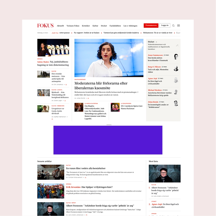 En av de kunder vi jobbar tätt ihop med i mediabranschen är Fokus. Tillsammans har vi utvecklat deras app, där läsarna kan ta del av artiklar, lyssna på podcast direkt i den inbyggda podd-spelaren, och få push-notiser när nya artiklar släpps. Vi jobbar också löpande med design och utveckling av deras webbplatform.
